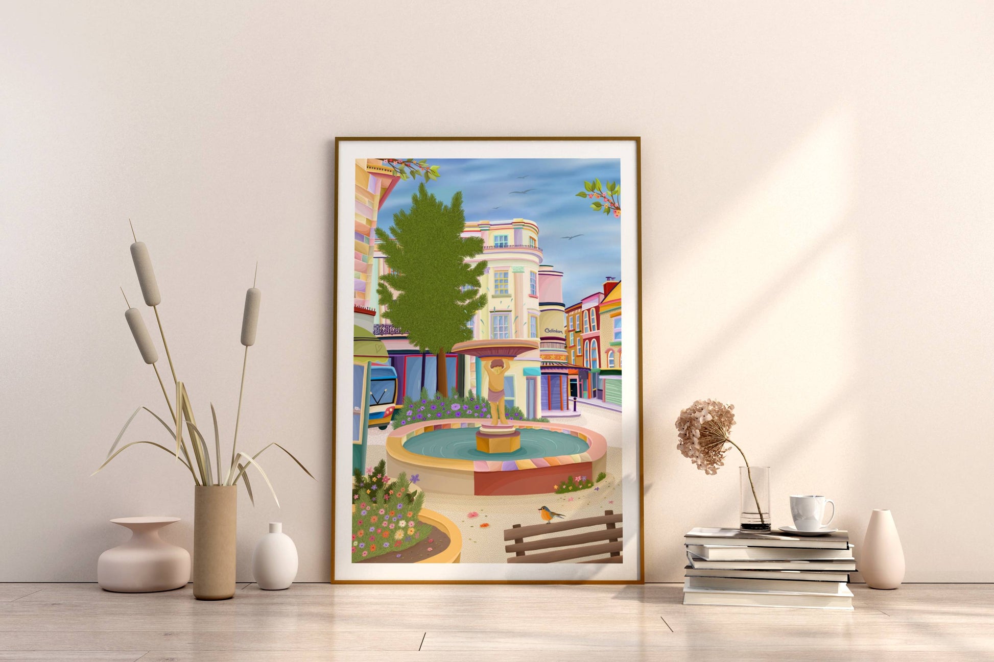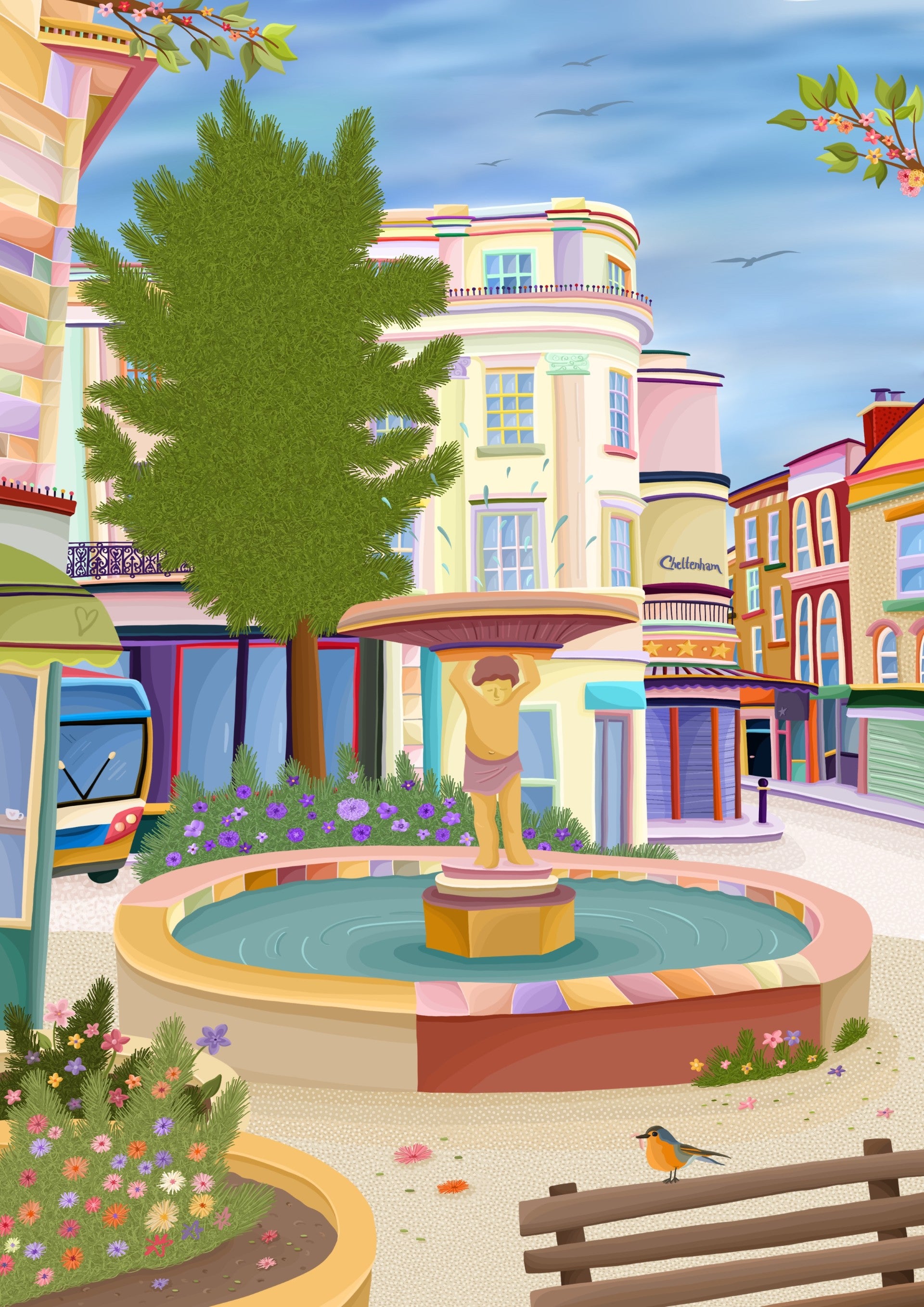 Colourful illustration of the central shopping area of Cheltenham Town.