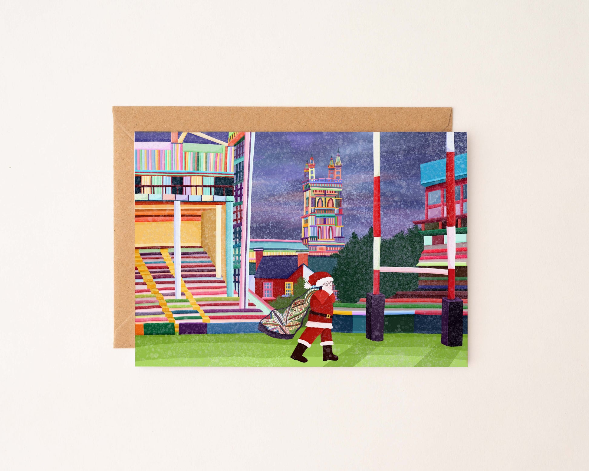 Greeting Card with illustration Santa with a sack of rugby balls, walking through Gloucester Rugby's Kingsholm Stadium, with the Cathedral pictured in the background of the snowy night.