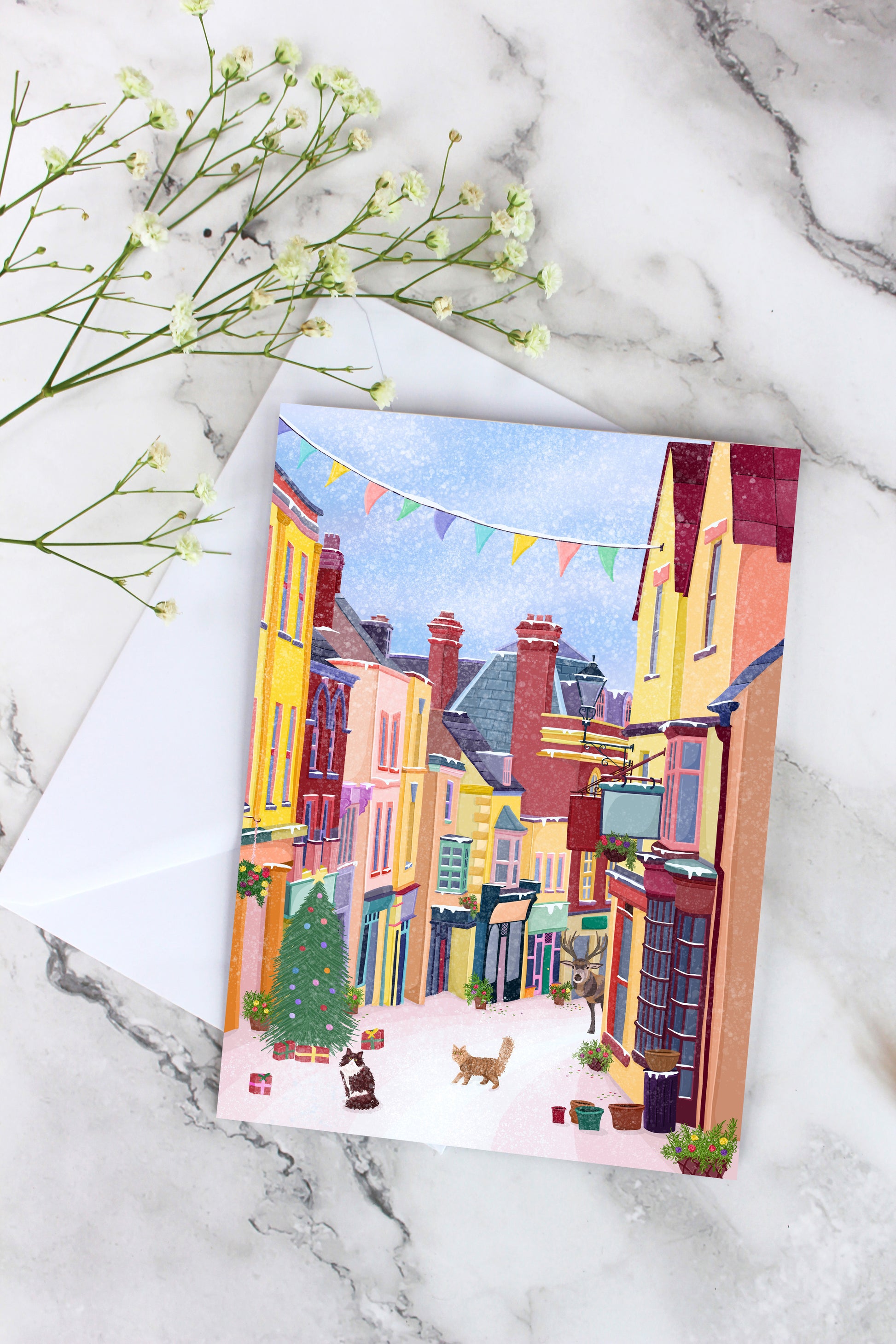 Illustration of Stroud High Street, with a light dusting of snow and a reindeer on the corner.