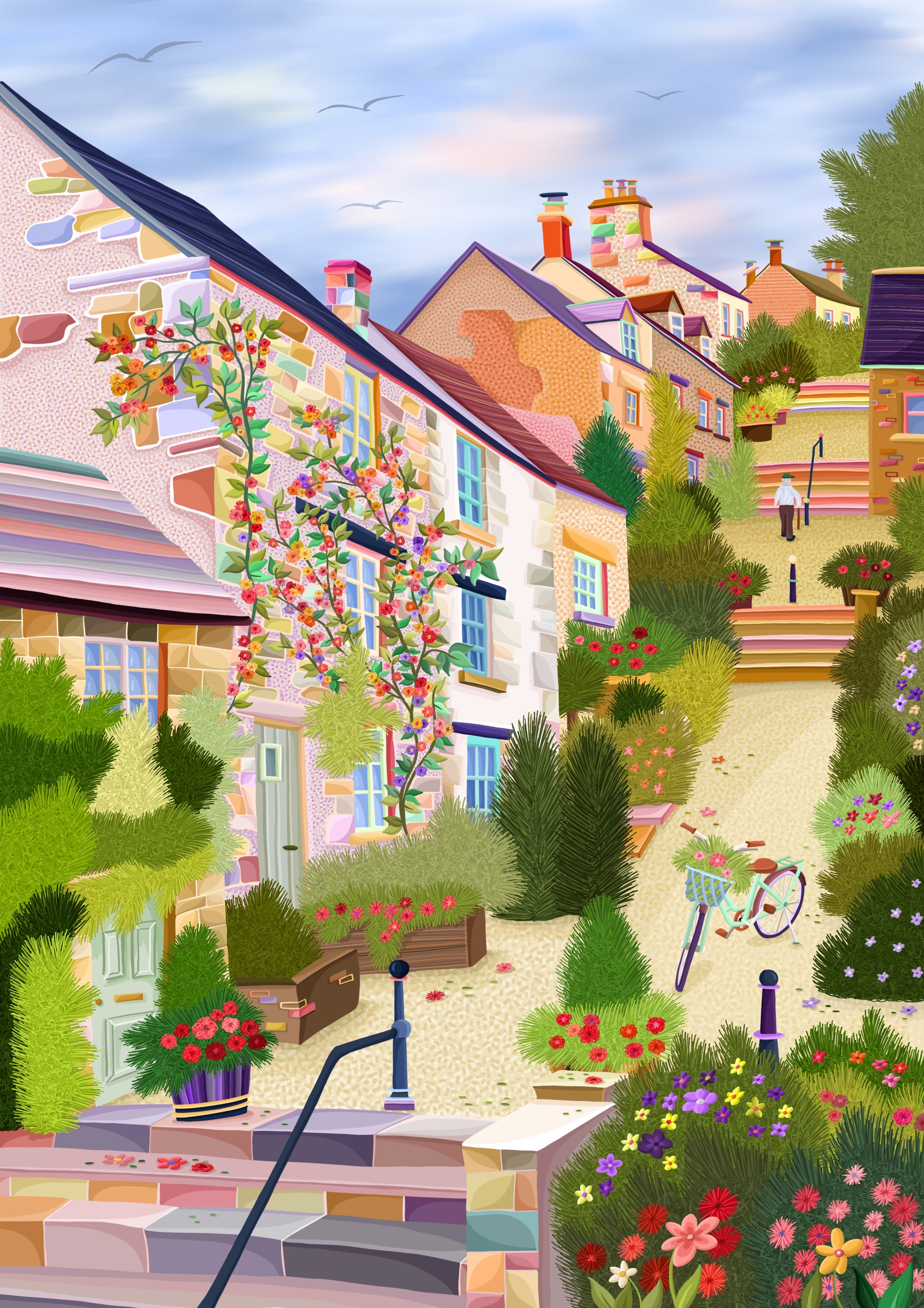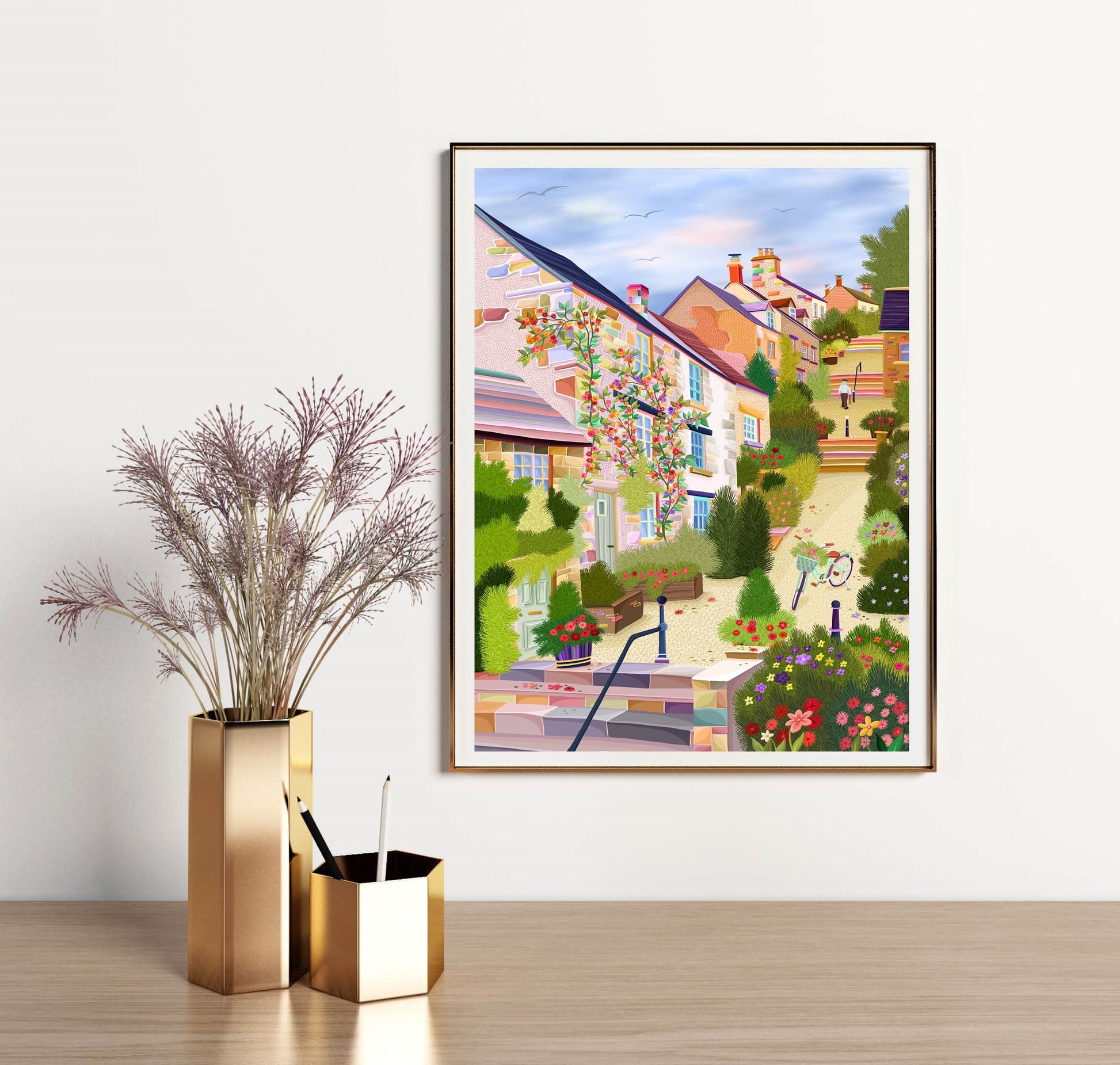 Colourful illustration of Tetbury Chipping Steps - a popular spot in the beautiful Cotswolds town.