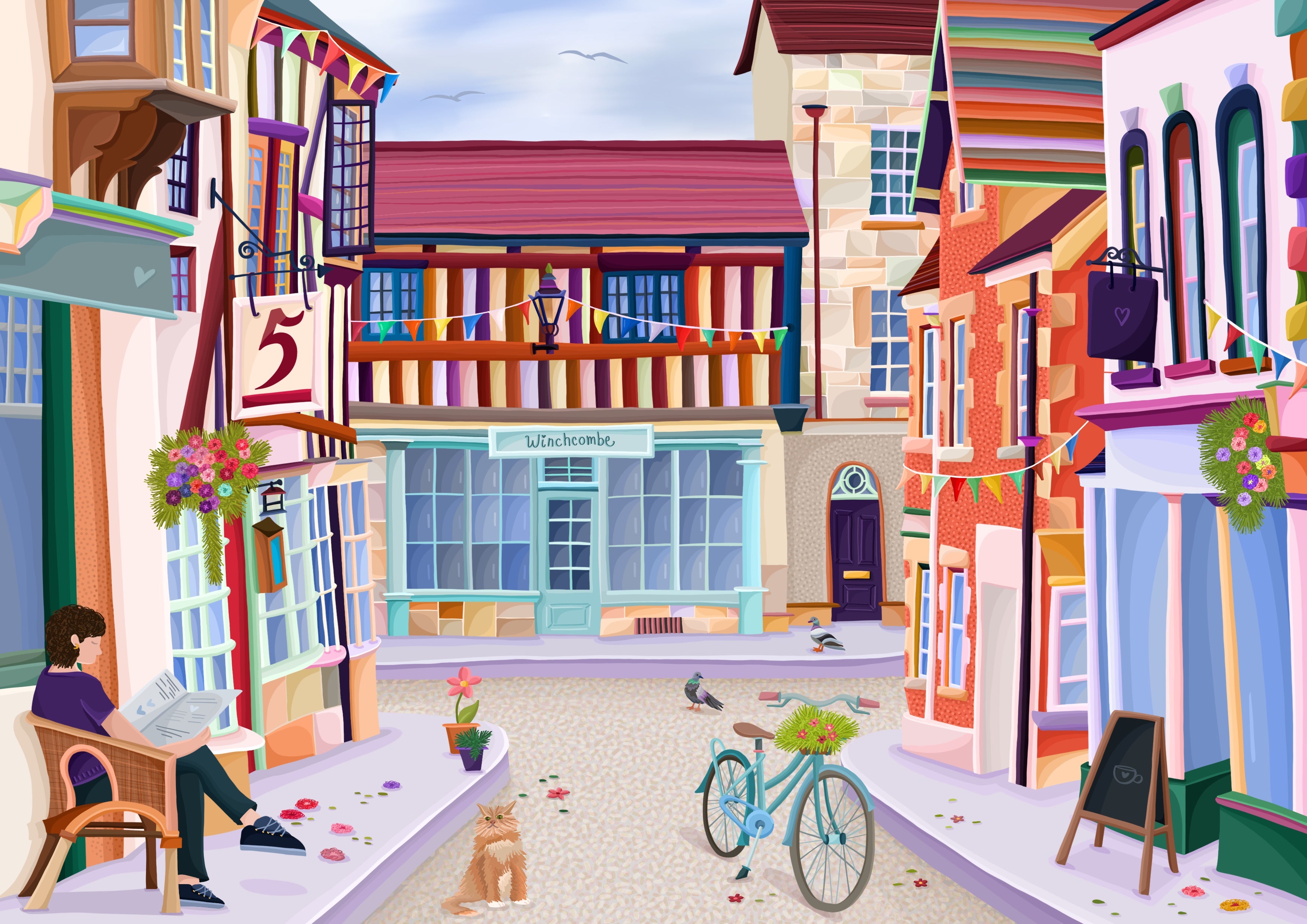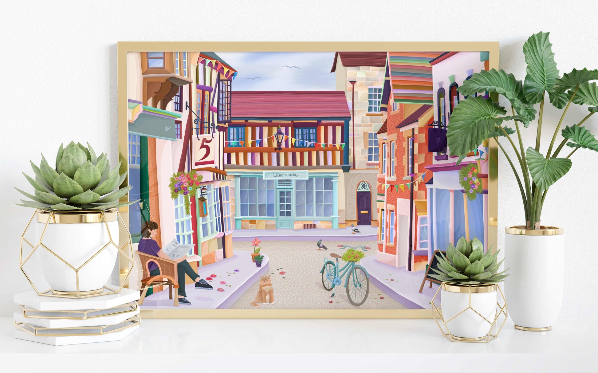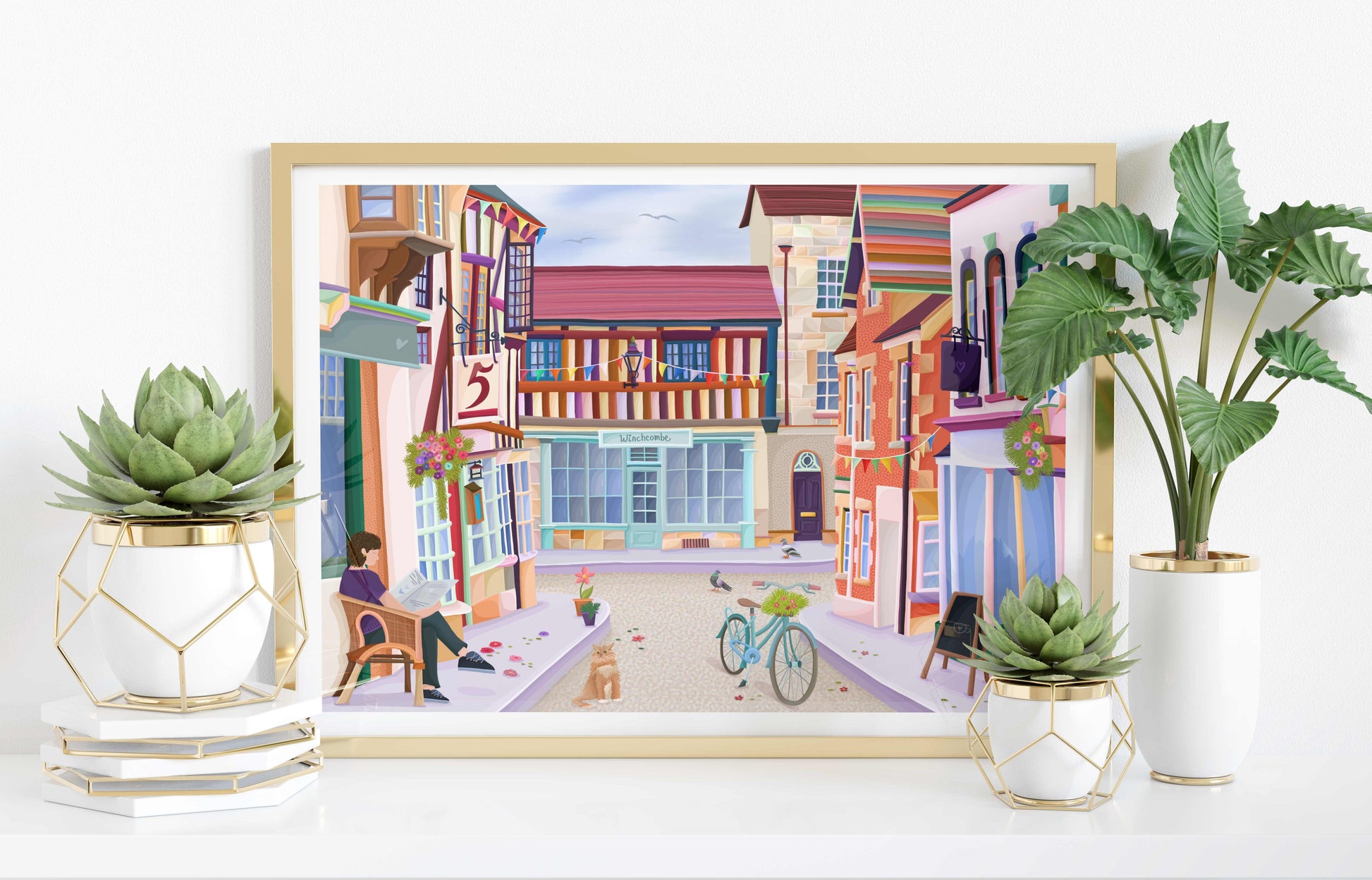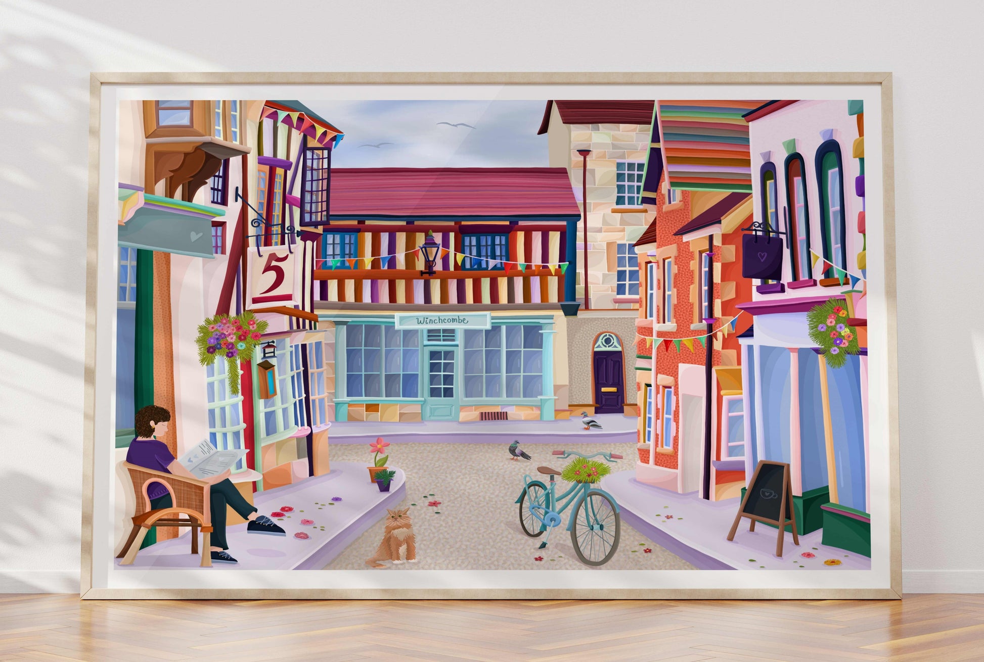 Colourful illustration of North Street in Winchcombe, a charming Cotswolds Market Town.